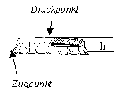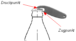 Zug und Druckpunkt des Flaschenöffners liegen circa 16 mm voneinander entfernt. Um beim Druckpunkt keine zu spitze Form zu erreichen (durch die der Kronenkorken verletzt würde), werden 2 mm aufgeschlagen, welche ermöglichen, den Öffner an dieser Stelle abzurunden oder abzuflachen.