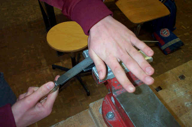 Um Verletzungen zu vermeiden werden anschließend sofort sämtliche Kanten des Materials mit der Metallfeile entgratet. |