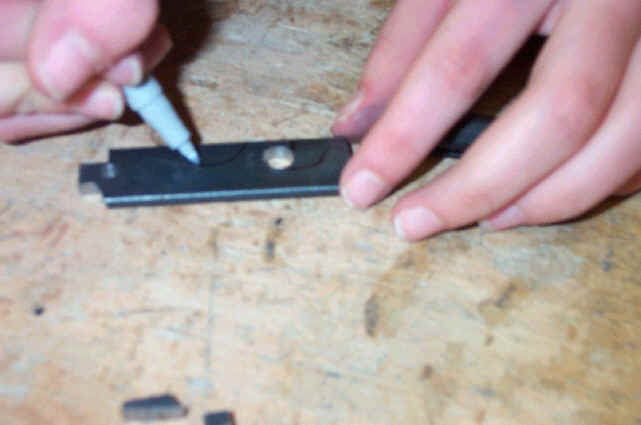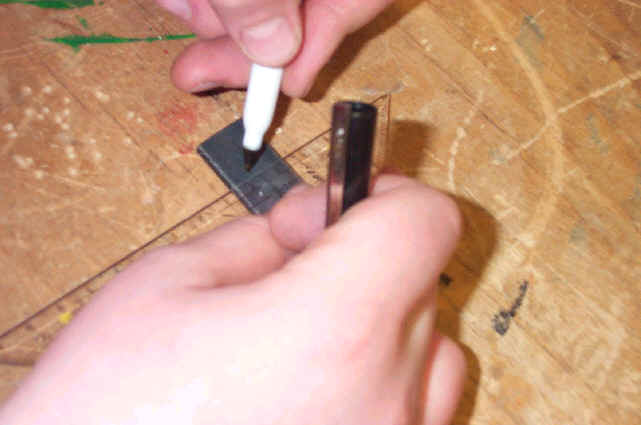 Nächster Schritt ist das Anzeichnen der Bohrung für die Funktionsöffnung. Hierbei muss auf das genaue Einhalten der Maße geachtet werden. Es bleibt der Lehrkraft überlassen, wie die Schüler die Bohrung anzeichnen sollen. Fachgerechtes Anreißen mit Reißnadel und Stahlschiene ist ebenso möglich, wie die für Schüler einfachere Variante des Anzeichnens mit Folienstift und Lineal. |