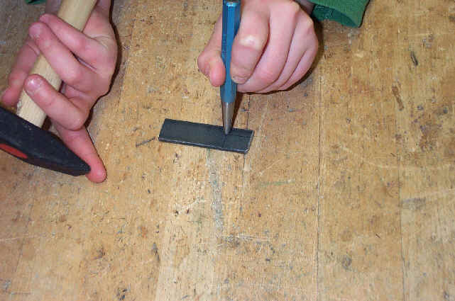 Anschließend wird die Stelle, an der gebohrt werden soll, angekörnt. Werkzeuge: Körner, Schlosserhammer