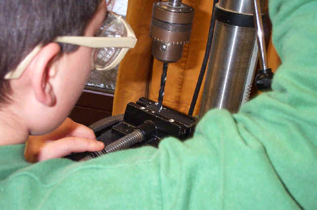 Das Loch wird (falls schon mehrere Löcher angezeichnet sind "die Löcher werden") nun an der Ständerbohrmaschine gebohrt.