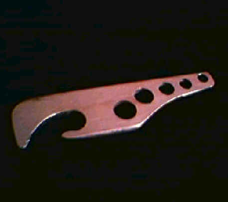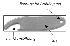 Der nun festgelegte Punkt dient als Mittelpunkt für die Bohrung. Die Öffnung muss anschließend mit Säge und Feile herausgearbeitet werden. Die restliche Gestaltung des Kronenkorkenöffners liegt in der Hand des Schülers. Hier noch einmal die wichtigsten Bestandteile des Öffners: