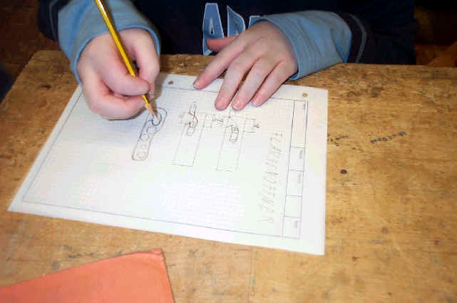 Nun beginnt die eigentliche Arbeit am Werkstück. Die Schüler sollen zuerst einmal eine Zeichnung des Werkstücks erstellen, in der die Funktionsöffnung und die Aufhängungsöffnung, sowie die Gestaltung des Griffes bereits festgelegt werden.