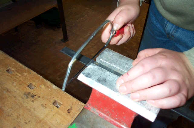 Anschließend wird das Maß für die Länge des Werkstücks (80 - 100 mm) auf den Bandstahl aufgezeichnet und der Stahl mit der Puksäge abgelängt.