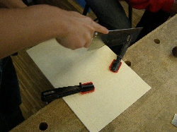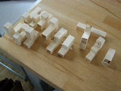 Ein Nachteil allerdings ist die lange Arbeitszeit für das Werkstück. Da alle Teile einzeln von einer Holzleiste abgelängt und anschließend verleimt werden müssen, benötigt dieser Teil der Arbeit einen langen Zeitraum, in dem die Schüler immer dieselben Arbeitstechniken (vor allem den Umgang mit der Feinsäge) anwenden. Wem diese ausführliche Einübung eines einzelnen Verfahrens zu langwierig ist, dem rate ich davon ab, dieses Werkstück zu bauen und rate eher dazu, ein Thema zu wählen, bei dem in derselben Zeit sicherlich drei oder vier unterschiedliche Werktechniken erarbeitet werden können. Bei der 8. Klasse, mit der ich dieses Werkstück zum ersten Mal durchgeführt habe, stellte sich die lange Zeit der Teilebearbeitung allerdings eher als Vorteil heraus, weil es mir so möglich war, erst einmal viel pädagogisch mit der doch sehr unruhigen Gruppe zu arbeiten. Ein aufwendigeres Werkstück hätte mir diesen Rahmen sicherlich weniger geboten. |