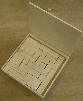 Eine schöne Idee, die ich mir von einem Spielzeug meines Neffen abgeschaut habe. Die Schüler fertigen eine Schachtel mit unterschiedlich geformten Puzzleteilen. Aufgabe ist es später, die Teile so in der Schachtel zu platzieren, dass alle wieder hinein passen. Es gibt unterschiedliche Lösungsmöglichkeiten für das Puzzle und zusätzlich viele Möglichkeiten, Formen mit den Holzteilen zu legen.