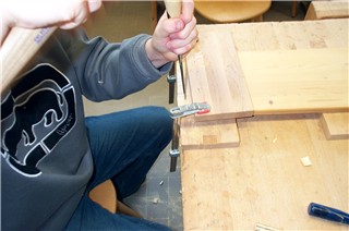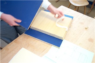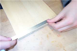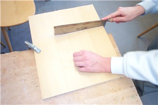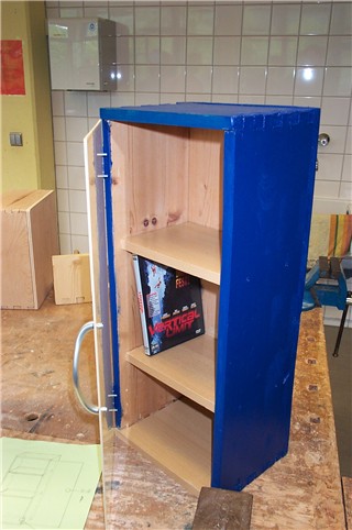 Zwischenböden werden angefertigt, die einzelnen Bauteile werden zusammengesetzt. Aus Plexiglas wird ein Türchen hergestellt und mit Scharnieren an das Schränkchen montiert. Mit einem Türgriff versehen, ist das Werkstück schließlich fertig |