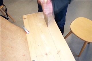 Die Materialteile zur Herstellung des DVD-Ständers werden entpackt. Der Schüler hat bereits bei der Planung beachtet, für die Außenteile Vollholz zu verwenden, welches stabil ist und gut durch eine Holzverbindung zusammengefügt werden kann. Die inneren Bestandteile sollen aus Spanplatten entstehen, die mit einem Kunststofffunier beschichtet sind. |