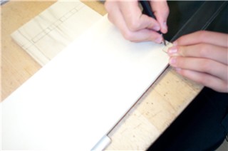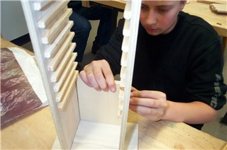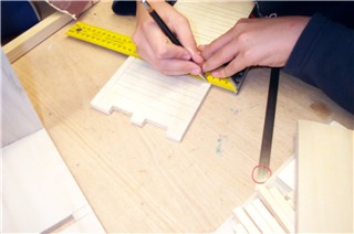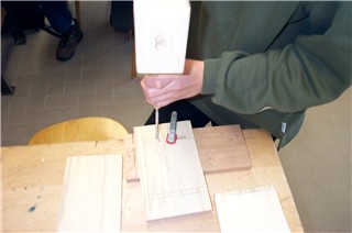 Anschließend, nach dem Stemmen der kompletten Holzverbindung, zeichnet der Schüler die Positionen für die Einschub-Leisten ein. |