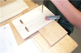 Auf dem nächsten Bild ist zu sehen, wie der Schüler die Holzverbindungen für die beiden zu verbindenden Teile (Seitenteil und Bodenplatte) anzeichnet. Natürlich ist Sperrholz nicht das geeignetste Material, um eine Holzverbindung anzubringen. Doch nach gemeinsamer Besprechung entschieden wir, die Zapfen relativ breit anzulegen, so dass die Stabilität vielleicht doch gegeben sein würde.