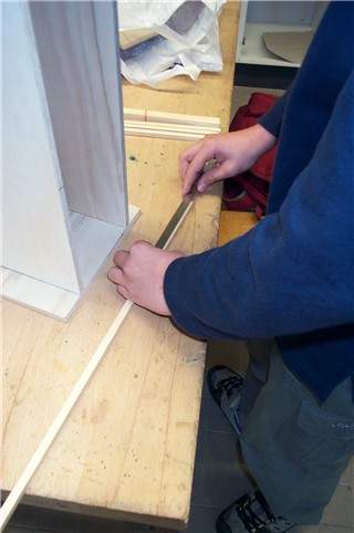 Die Länge der nötigen Einschubleisten wird hier auf die Vierkantleisten aufgezeichnet. |