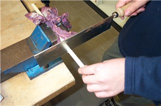 Hier stemmt der Schüler bereits die Zapfenverbindung für das Werkstück. |