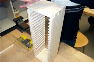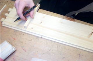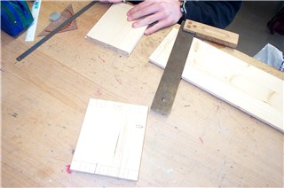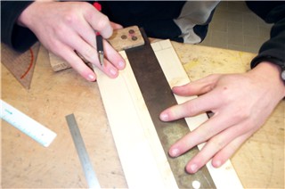 Hier zeichnet der Schüler bereits die Holzverbindung (eine Fingerzapfenverbindung) auf das Holz auf... |