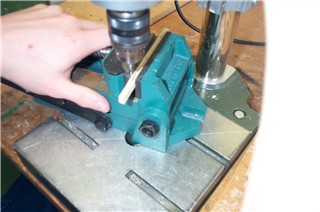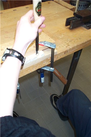 Der Schüler bohrt an den Stellen, an welchen die Leisten in den CD-Ständer genagelt werden sollen, Löcher vor, um ein Reißen des Holzes zu verhindern. |