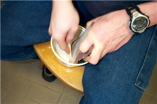 Der Schüler stellt Holzspäne her, um sie anschließend mit Holzleim zu einem selbstgemachten Holzkitt zu vermengen. So können kleinere Ungenauigkeiten ausgebessert werden. |