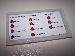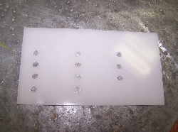 Auf die Deckplatte habe ich die Tabelle, welche ich vorher einlaminiert habe, aufgeklebt. Anschließend habe ich die Löcher mit einem Universalmesser (Tapetenmesser) ausgeschnitten. In die Löcher wurden nun die Taster eingeschraubt. |