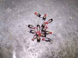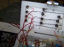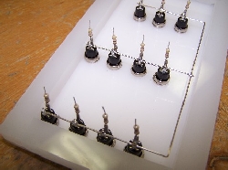 Einen der Pole sämtlicher Schalter habe ich dann mit festem Silberdraht verbunden. Dieser würde später direkt zum einen Pol der Batterie führen. |