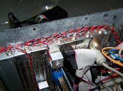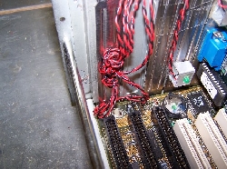 Um die einzelnen Bauteile gut erkennen zu können, war es nötig, die Kabel im Innern umzulegen. Gerade in älteren Computern finden sich noch besonders breite Kabelbänder, bei denen die Verlegung etwas schwierig ist. Dennoch war es mir wichtig, alle Anschlüsse vorhanden zu lassen, um wirklich alle Zusammenhänge der einzelnen Bauteile im Original darzustellen. Mein Ziel war es, am Ende einen Computer als Schaukasten zu haben, der dennoch noch immer voll funktionsfähig ist. |
