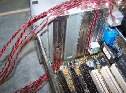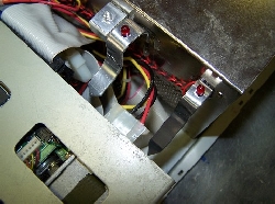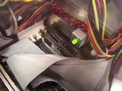 Dieser Vorgang musste natürlich für alle wichtigen Positionen wiederholt werden. Ich habe die Leuchtdioden dabei nach unterschiedlichen Themenbereichen farblich unterschiedlich gehalten. Bauteile auf der Platine wurden mit einer grünen, Laufwerke mit einer roten und alle sonstigen Bestandteile mit einer gelben LED versehen. |