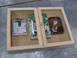 Hier ein Schaukasten zum Thema Laufwerke. Inhalt von links nach rechts: 3,5''-Disketten-Laufwerk, DVD-Rom-Laufwerk, Festplatte. |